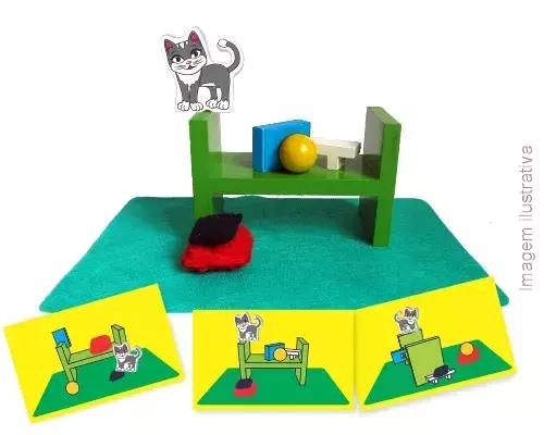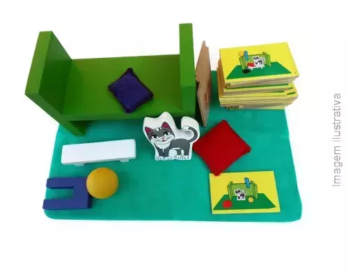 pintado na cor verde, 01 gato representativo em MDF de 15 mm, 01 tapete em TNT, 02 almofadas, 03 acessórios e 30 fichas ilustradas medindo 85 x 53mm x 3mm.